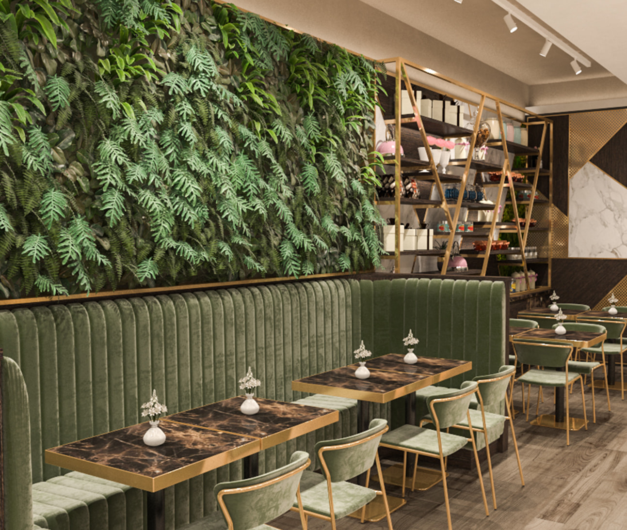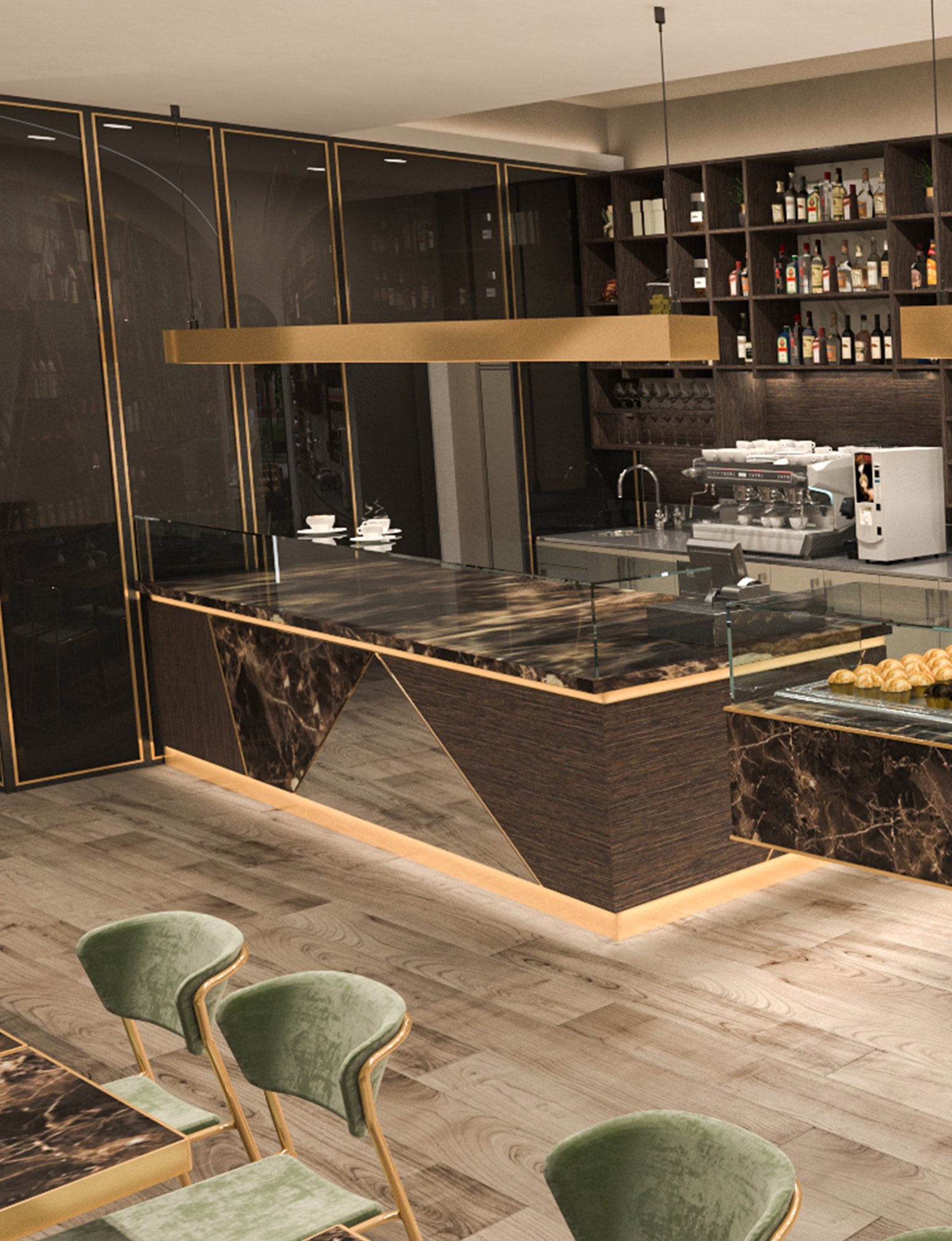 Contemporaneità, raffinatezza e modernità sono le parole chiave per questa pasticceria. Il bancone sospeso rivestito in marmo, le finiture in ottone e velluto e la parete green donano un’atmosfera ricercata e pregiata.