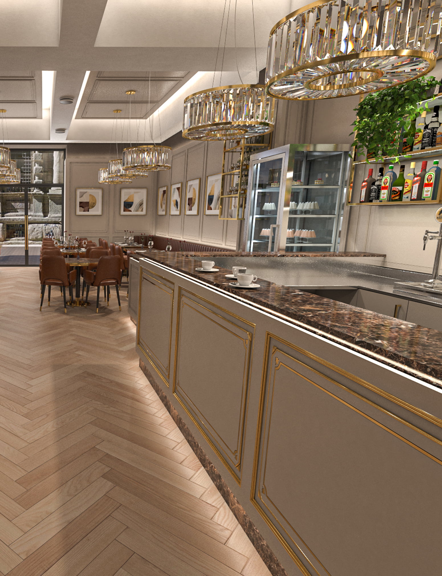 Il ristorante è caratterizzato da boiserie, dettagli in ottone e cuoietto, piani in marmo e pavimenti in legno a spina di pesce che riflettono uno stile raffinato ed elegante. L’uso della luce crea atmosfere suggestive, regalando un’esperienza visiva unica.